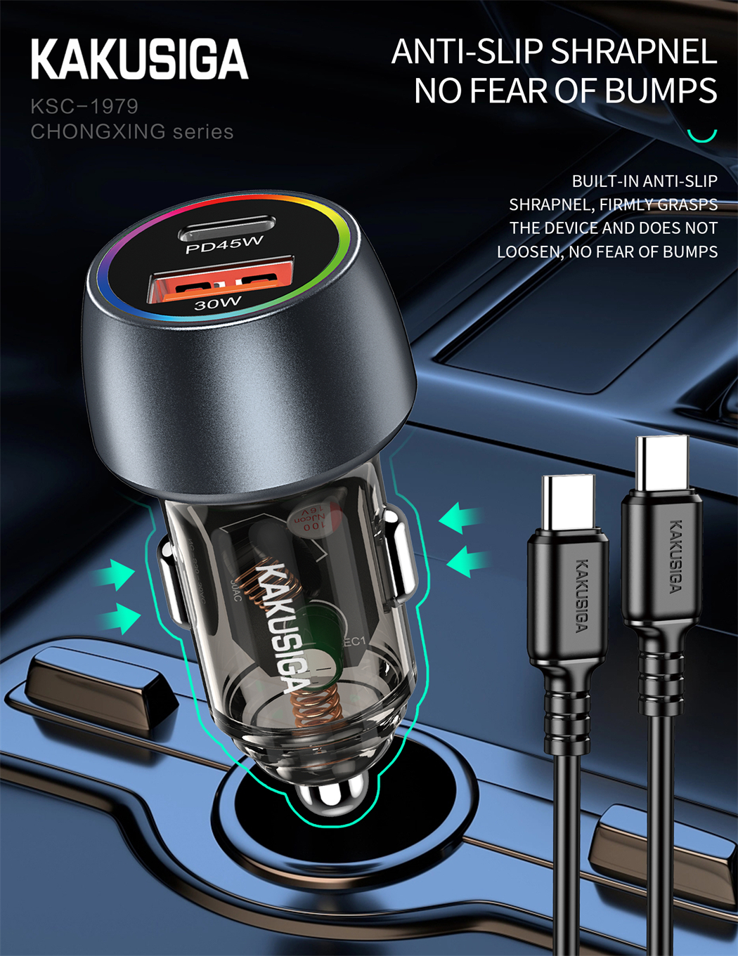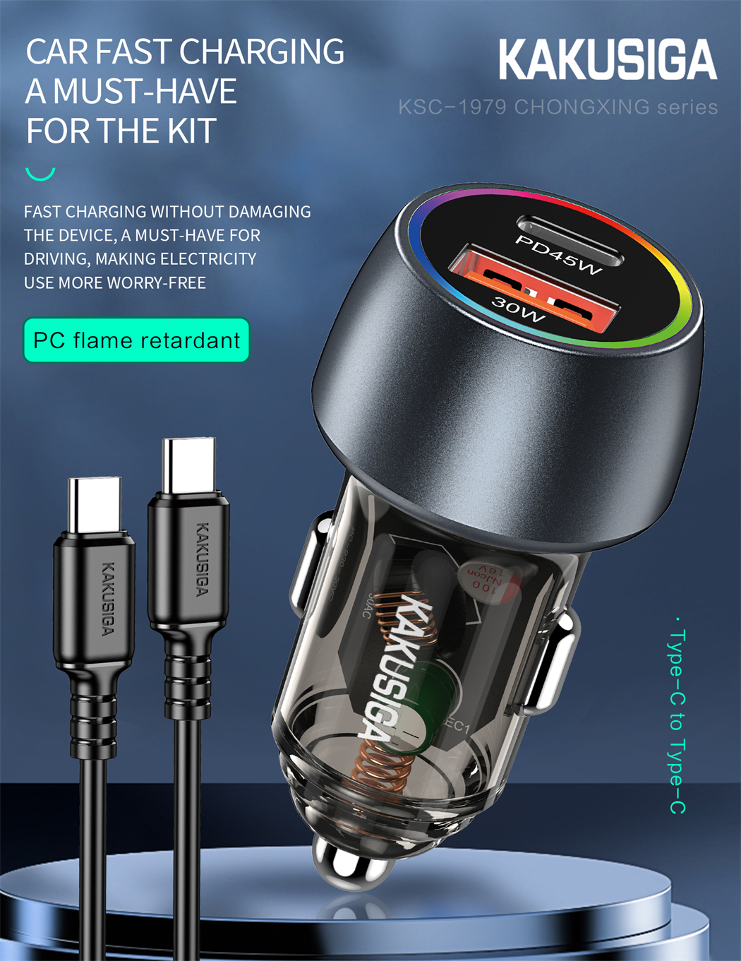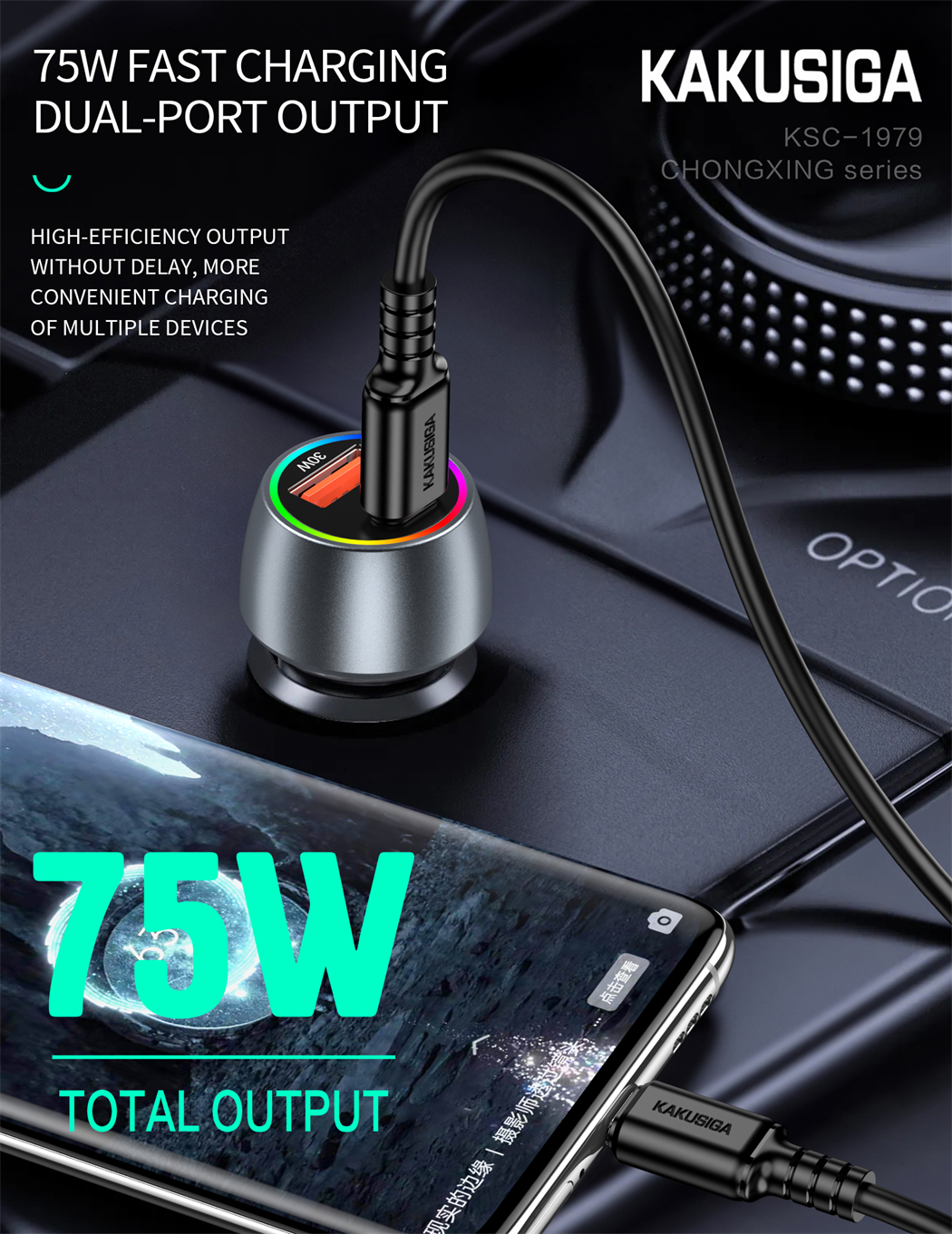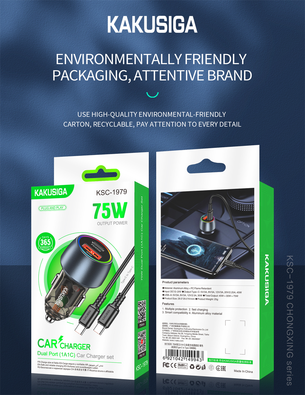 name:CHONGXING series 75W dual port (1C1A) car charger set